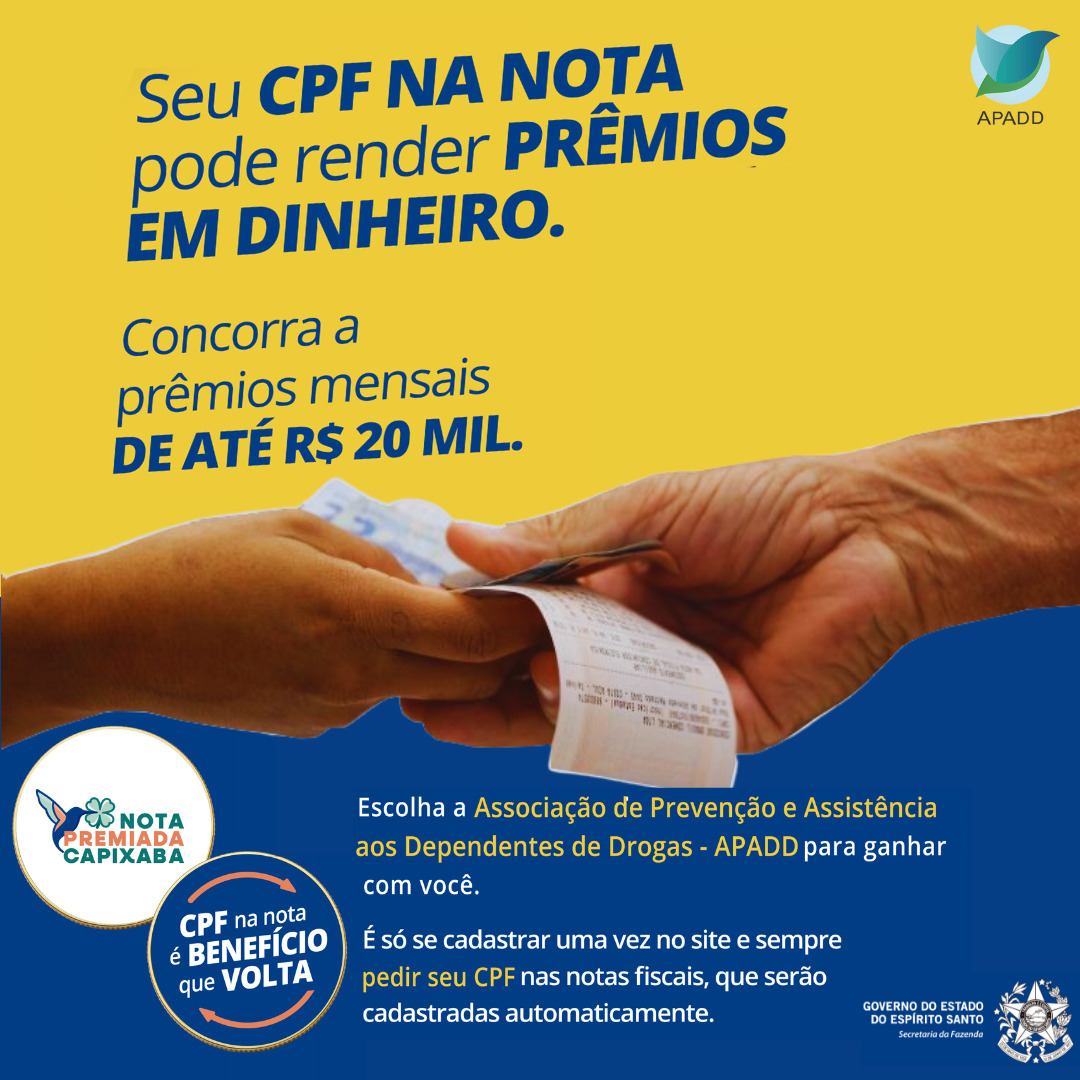 A Associação de Prevenção e Assistência aos Dependentes de Drogas – APADD é uma das instituições beneficiadas pelo Programa Nota Premiada Capixaba. Essa iniciativa do Governo do Estado do Espírito Santo, promovida pela Secretaria de Estado da Fazenda (SEFAZ/ES), faz parte do programa de Educação Fiscal e busca incentivo à participação dos cidadãos. O objetivo é garantir a emissão correta dos documentos fiscais e garantir que os recursos públicos sejam aplicados de forma adequada.