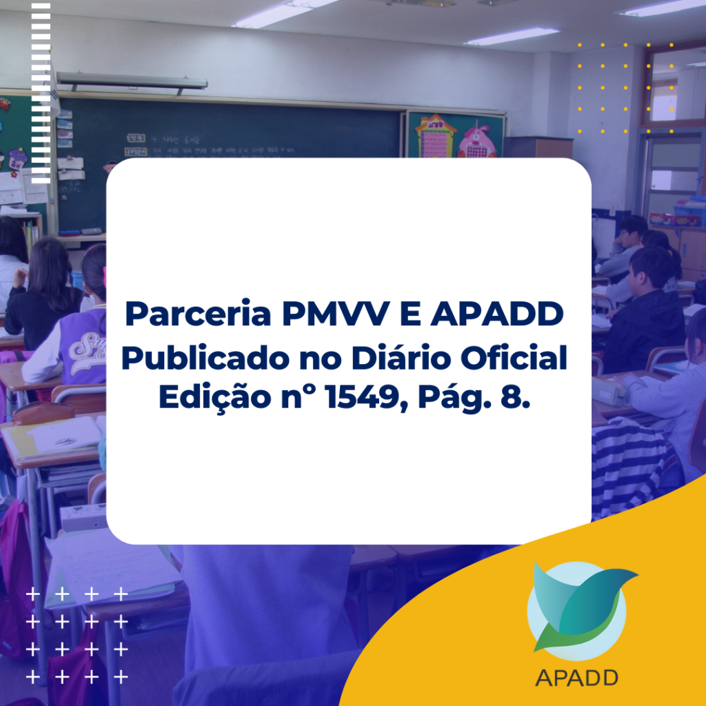 Em 01 de novembro do corrente ano, foi publicado no Diário Oficial Edição nº 1549, Pág. 8, a parceria PMVV X ASSOCIAÇÃO DE PREVENÇÃO E ASSISTENCIA AOS DEPENDENTES DE DROGAS – APADD, o PROCESSO Nº 69.041/2022, com objetivo de promover rodas de conversa sobre a prevenção ao uso de drogas junto aos alunos das escolas públicas Municipais de Vila Velha, a partir de janeiro de 2023.